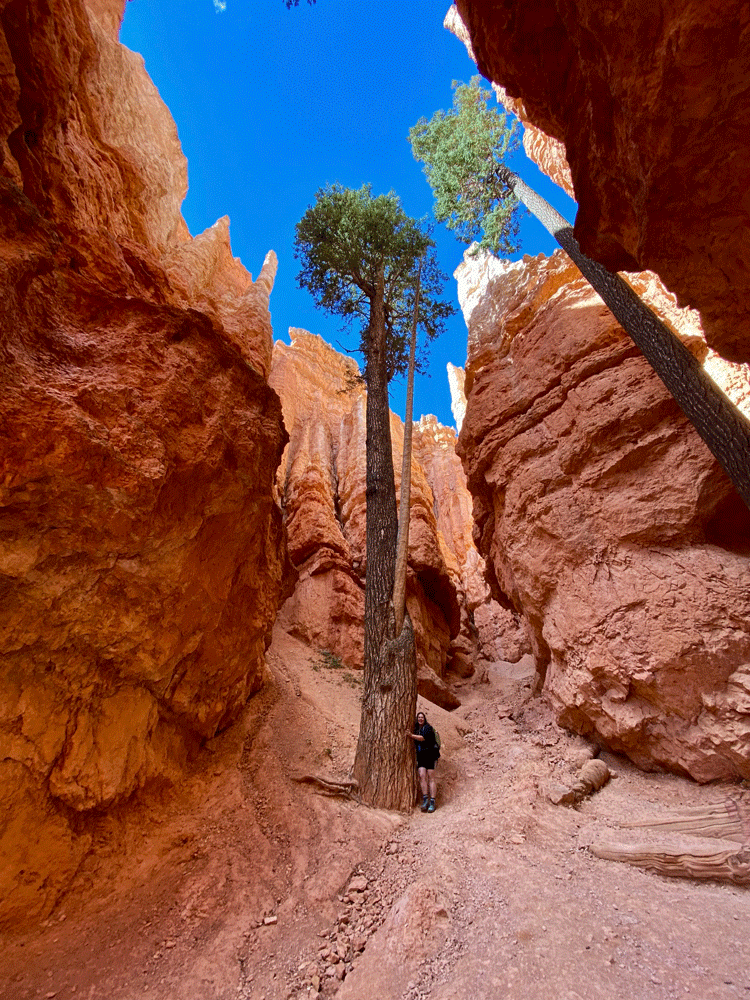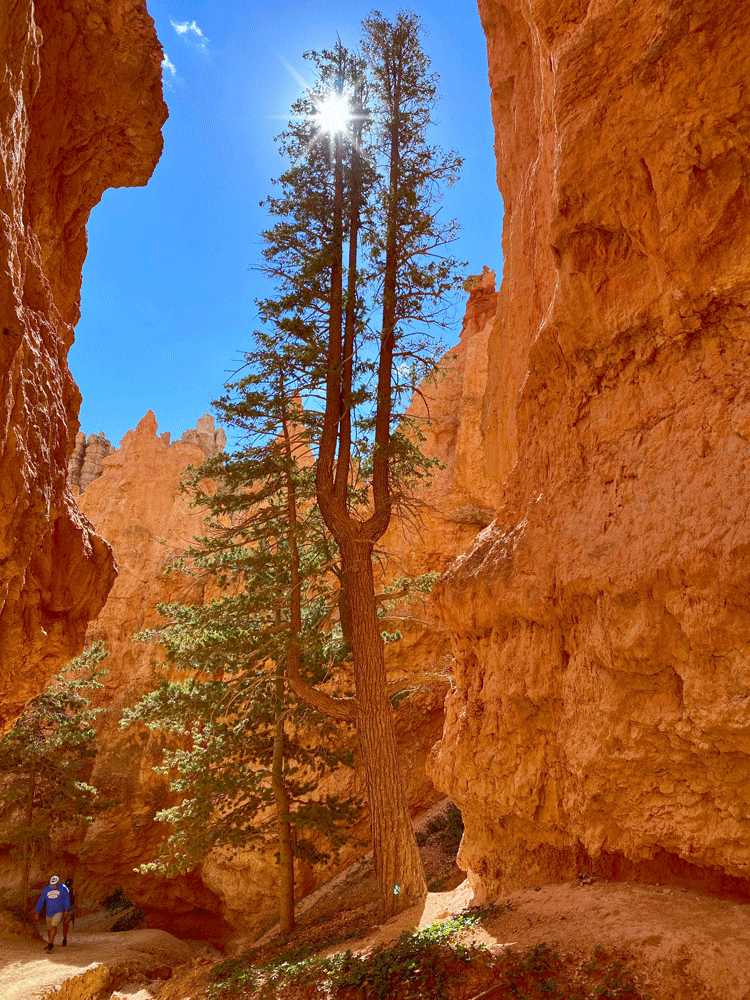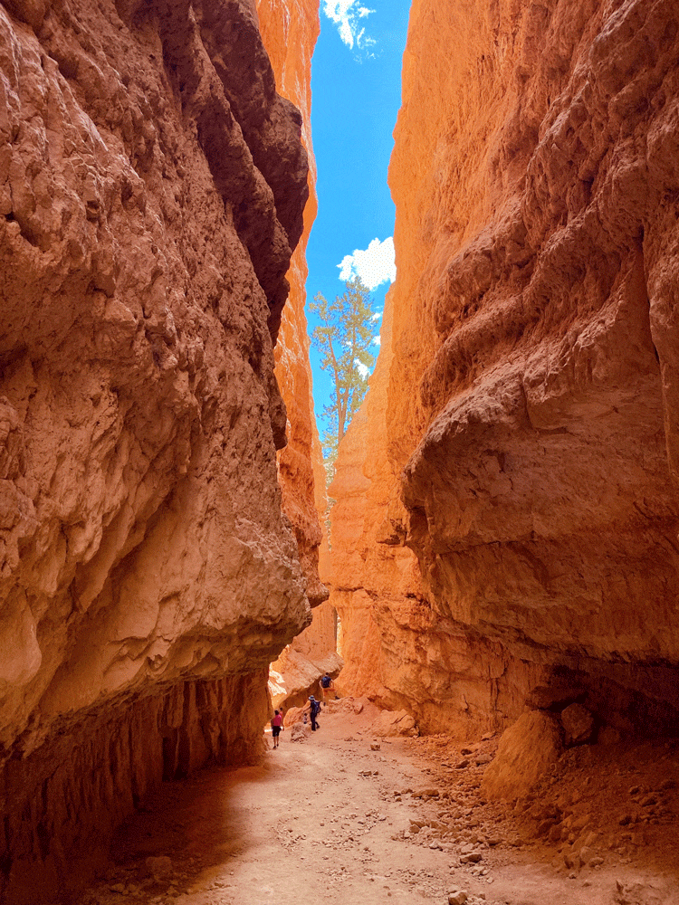 Im Zick-Zack marschierten wir in eine einzigartige Welt aus Sandstein-Säulen, Bögen und Felsformationen hinab. Die Farben der Felsen reichen von weiß bis hin zu rötlichem Braun und veränderten sich mit jedem Lichtstrahl. Obwohl der Weg an einigen Stellen steil ist, geht es Dank der Serpentinen relativ langsam bergab. Schließlich verengt sich die Schlucht und beginnt, einem Slot Canyon zu ähneln. Dieser Abschnitt des Navajo Loop Trail ist aufgrund der steilen Klippen und engen Passagen als Wall Street bekannt.