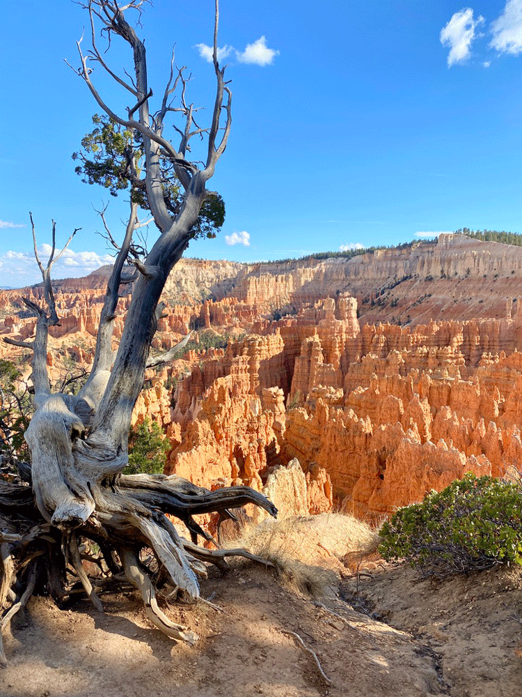 Die Sonne hatte den Bryce Canyon nach unserer Wanderung bereits in warmes Licht getaucht. Obwohl wir ihn gerade hautnah erlebt hatten, konnten wir uns von seinem Anblick nicht trennen und spazierten noch ein wenig an der Abbruchkante entlang. Wir fanden einen Baum mit großen Wurzeln, auf die wir uns setzten, um noch ein wenig das Schauspiel der Hoodoos im Amphitheater unter uns zu beobachten. Plötzlich ergriff eine alte Dame mit Stock, die plötzlich aus dem Nichts erschien, das Wort: „Sehen Sie doch, da kann uns doch niemand weiß machen, dass so etwas durch Wind, Regen und sonst welche natürlichen Gegebenheiten entsteht. So etwas kann nur Gott erschaffen!“