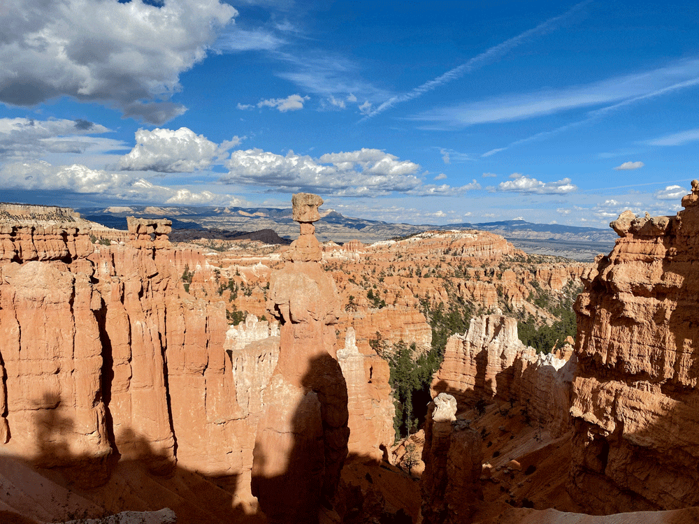 Nach gut anderthalb Kilometern erreichst du das Tal des Canyons, wo auch der Queen’s Garden Trail abzweigt. Hier wird der Weg etwas flacher und führt durch eine malerische Landschaft aus bizarren Felsformationen, Pinien und Büschen. Unterwegs warten Highlights wie die Queen Victoria Formation und der Queen’s Garden. Gleich hinter dem Queen’s Garden geht es wieder zurück zum Ausgangspunkt. Der Weg führt anfangs etwas steil bergauf, wird aber bald wieder flacher und bietet erneut spektakuläre Ausblicke auf den Bryce Canyon.