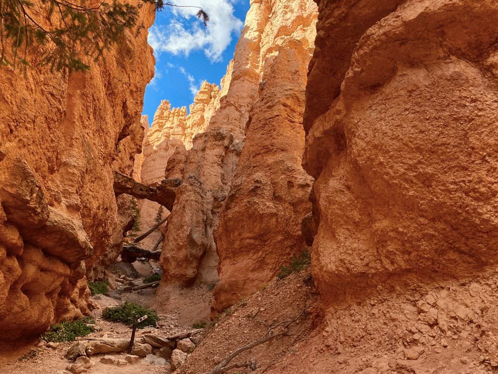 Die Wanderung beginnt am Sunset Point und führt zunächst auf dem Navajo Loop Trail steil bergab. Der Weg führt durch eine enge Schlucht, die von hohen Felswänden umgeben ist.
